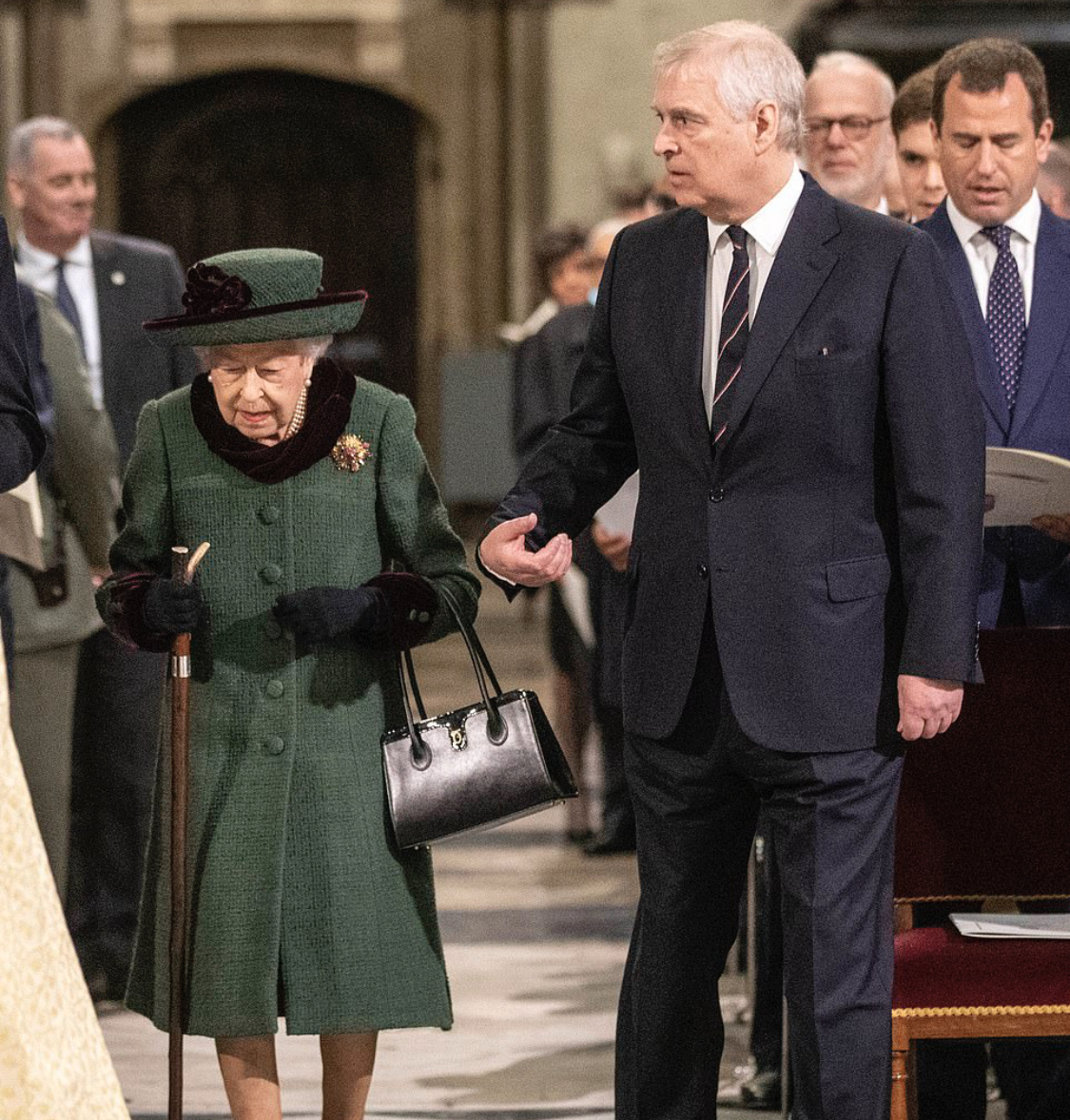 The Queen arrives at the service holding the Duke of York by the elbow with her left hand and her stick with the right