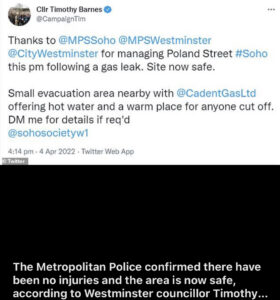 He tweeted: ‘Thanks to Soho and Westminster police, alongside Westminster council for managing Poland Street, Soho this afternoon following a gas leak.
