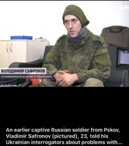 An earlier captive Russian soldier from Pskov, Vladimir Safronov, 23, told his Ukrainian interrogators about problems with rations, and how his officers were looting the civilian population.