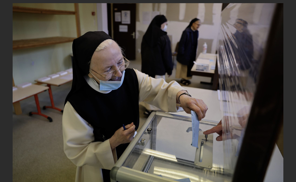 Bundled up against an April chill, voters lined up to cast ballots at a polling station in southern Paris on Sunday before it opened. Once inside, they placed their paper ballots into envelopes and then into a transparent box, some wearing masks or using hand gel as part of COVID–19 measures.