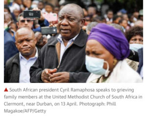 “We see such tragedies hitting other countries like Mozambique, Zimbabwe, but now we are the affected ones,” Ramaphosa said as he met grieving families near the ruins of the church.
