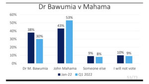 The previous report compiled by the Ghanaian polling company, in January 2022, showed 38 and 43 percent for Bawumia and Mahama respectively.