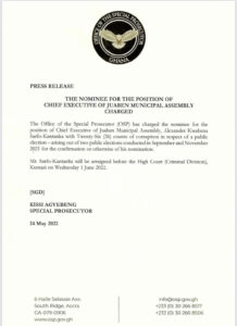 The Special Prosecutor, Kissi Agyebeng has charged the embattled Municipal Chief Executive aspirant for Juaben, Alexander Kwabena Sarfo-Kantanka with twenty-six counts of corruption in respect of public elections.