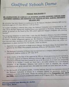 It is quite revealing to observe that when the National Cathedral was incorporated on 18th July 2019; the then Deputy AG, Godfred Dame was registered as Secretary. During that same period, he served on the board of the PPA which approved Adjaye’s irregular sole sourcing contract”, Mr. Ablakwa wrote on Facebook.