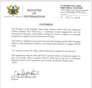 “The President of the Republic of Ghana, Nana Addo Dankwa Akufo-Addo, has authorised Finance Minister, Ken Ofori-Atta to commence formal engagements with the International Monetary Fund (IMF), inviting the Fund to Support an economic program put together by the Government of Ghana,” the statement said.