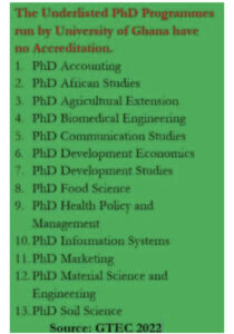 Thirteen (13) Doctor of Philosophy Degrees out of sixty-seven (67) offered by the University of Ghana including PhD in African Studies, Accounting, Food Science and Development Studies among other are not accredited.