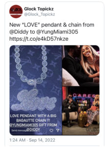 Could it be love for the Hip-Hop couple? On Tuesday (Sept. 13), Yung Miami took to her Instagram Stories to share a recent gift from Diddy hinting it might be. She showed off a stunning baguette chain and “Love” pendant from her boo. The new piece was made by celeb jeweler Benny The Jeweler, who also made a matching chain for Diddy.