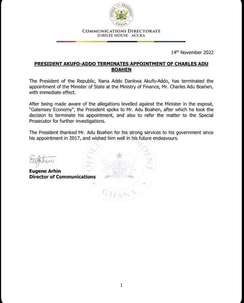 In a statement on Monday from the Presidency, the Director of Communications, Eugene Arhin, said, “After being made aware of the allegations levelled against the Minister in the exposé, ‘Galamsey Economyf’, the President spoke to Mr Adu Boahen, after which he took the decision to terminate his appointment, and also to refer the matter to the Special Prosecutor for further investigations.”