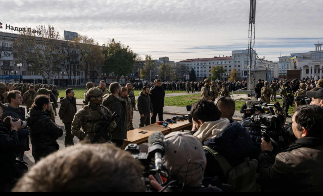 Minutes before Zelenskiy arrived, nearby shelling could be heard in the centre of Kherson and blasts of artillery gunfire echoed over the city. Heavy fighting continues across the region, as Ukrainian troops are likely to attempt consolidating control of the western bank in the coming days.