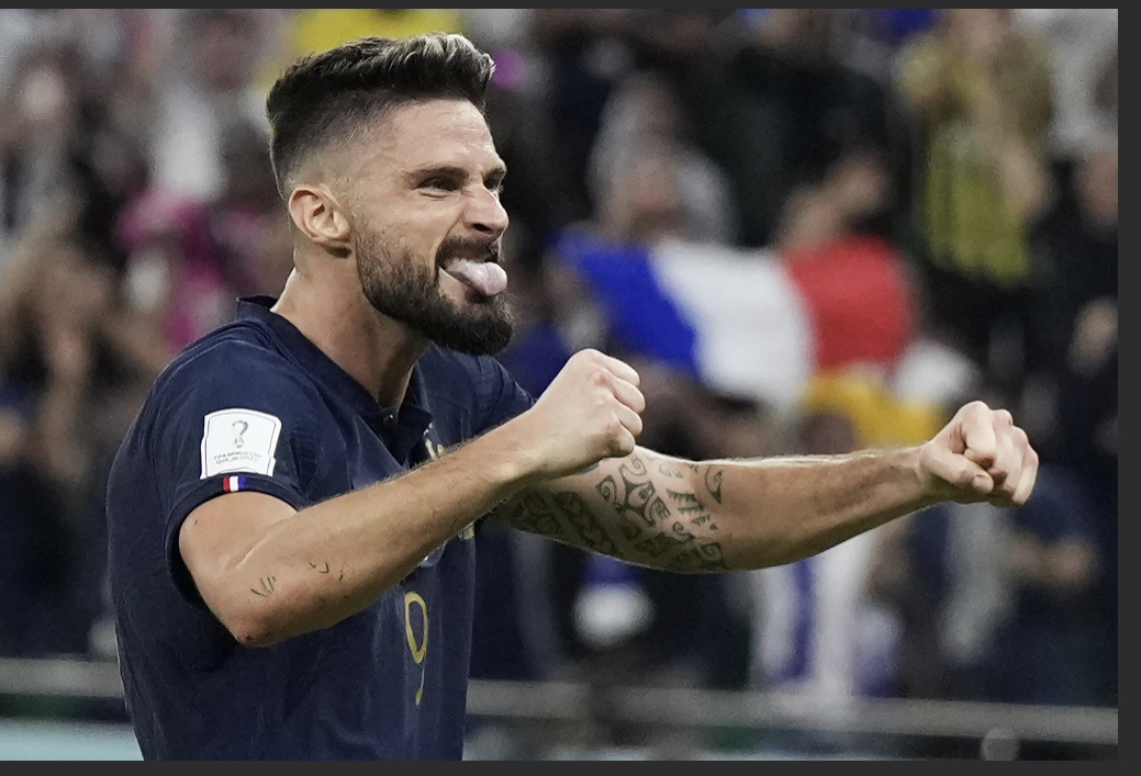 Against Poland on Sunday, Giroud picked up a pass from Kylian Mbappe in the 44th minute and sent a low shot with his left foot past Poland goalkeeper Wojciech Szczęsny, his former teammate at Arsenal. Mbappe added two of his own goals.