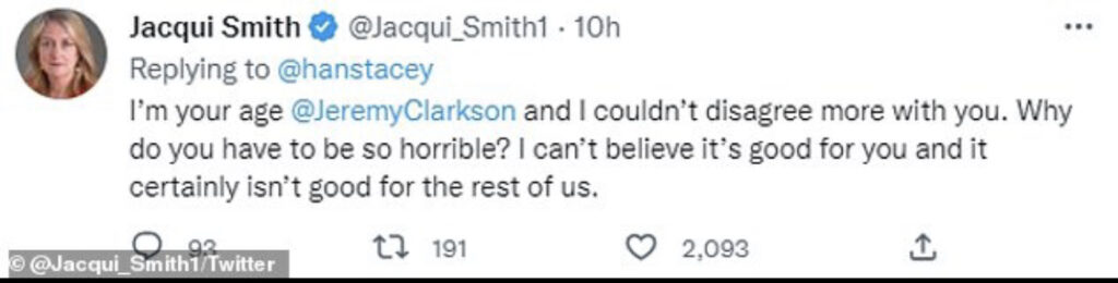 However, former Home Secretary tweeted: ‘I’m your age @JeremyClarkson and I couldn’t disagree more with you. Why do you have to be so horrible?