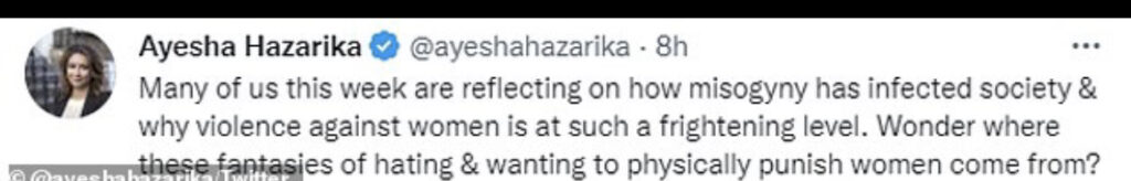 Ex-Labour spin doctor Ayesha Hazarika replied: ‘Many of us this week are reflecting on how misogyny has infected society & why violence against women is at such a frightening level.