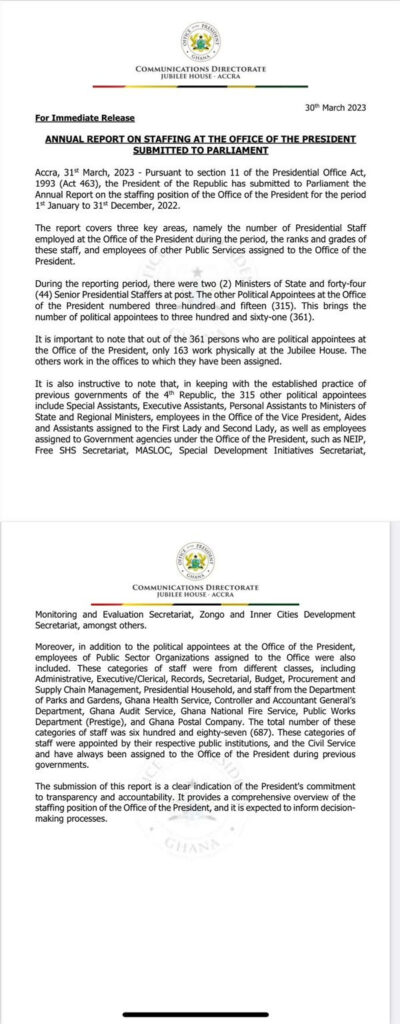 Pursuant to section 11 of the Presidential Office Act, 193 (Act 463), the President of the Republic has submitted to Parliament the Annual Report on the staffing position of the Office of the President for the period 1st January to 31st December, 2022.