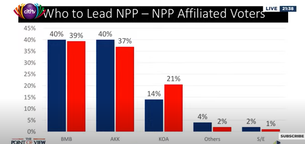 “Bawumia is backed by 39% of NPP supporters. You can see that Bawumia has been on a constant decline, whereas Alan stabilised in April 2022 at 41% all the way to January 2023 at 40% within that months. This poll covers NPP supporters only. In January 2022, Alan and Bawumia were tied at 40% each, now Dr. Bawumia has taken a slight lead,” he stated.