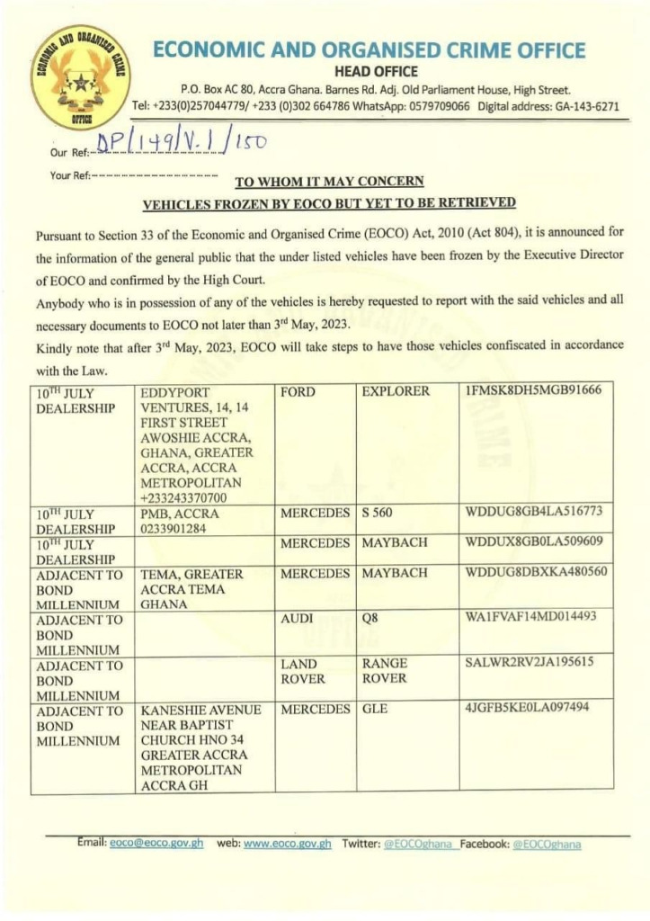In an April 18 statement, EOCO said the operation resulted in the retrieval of some luxury cars stolen from the United States of America and Canada.