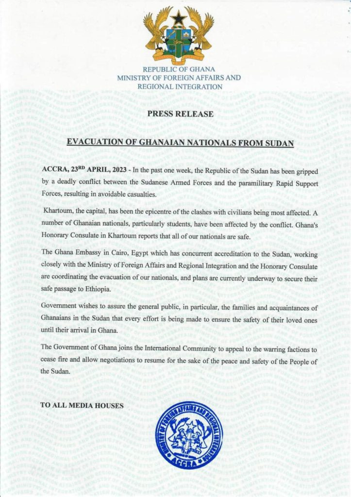 The government, through the Ministry of Foreign Affairs and Regional Integration, has revealed that all Ghanaian nationals residing in Sudan are safe despite the country’s turmoils.