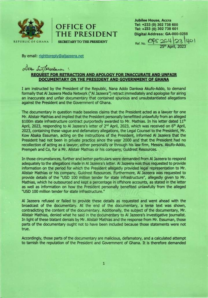 President Nana Addo Dankwa Akufo-Addo has officially written to the Al Jazeera Media Network, demanding a retraction and apology for tarnishing his image over what he described as ‘inaccurate and unfair’ reportage on Ghana’s first gentleman in its Gold Mafia documentary.
