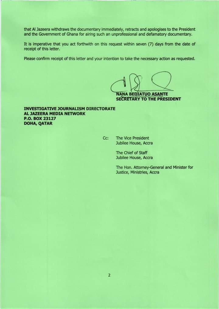 Nana Bediatuo Asante in the letter argued that parts of the documentary that indicted Akufo-Addo were malicious, defamatory, and a calculated attempt to tarnish the reputation of the President of Ghana.