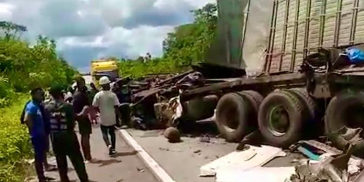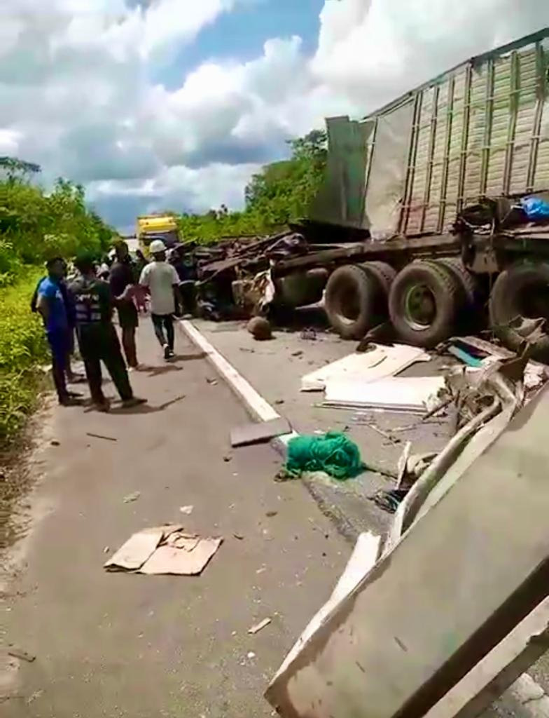According to eyewitness, the driver of the cargo truck and his mate lost their lives on the spot after they failed to control their cargo truck from crashing into the articulator truck.