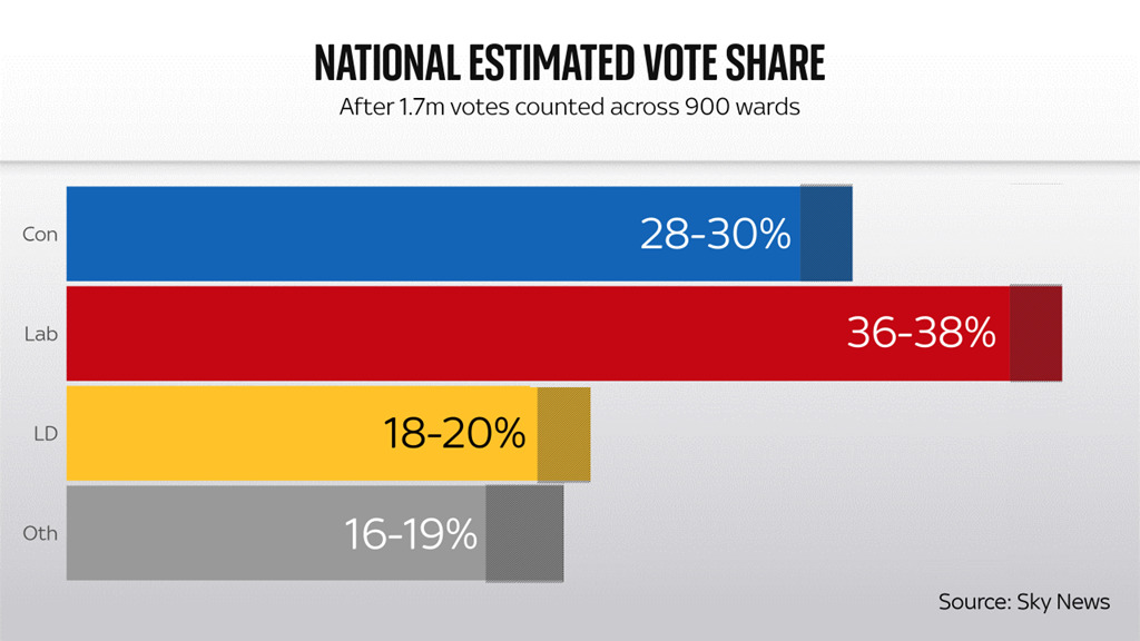 With all 1.7 million votes counted from the overnight declarations it becomes possible to narrow down the national estimated share for the main parties with a general election likely some time next year. It pays to be cautious with over 150 councils and more than six thousand seats still to decided.