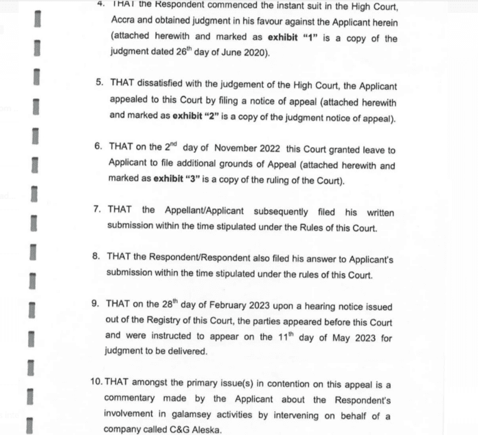 The application for an appeal dated 5th May 2023, said “Among the primary issue in contention on this appeal is a commentary made by the applicant [Kennedy Agyapong] about the respondent’s [Kwaku Baako] involvement in galamsey activities by intervening on behalf of a company called C&G Aleska.