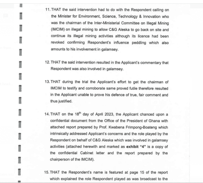 “On the 18th day of April 2023, the applicant [Kennedy Agyapong] chanced upon a confidential document from the Office of the President of Ghana with an attached report prepared by Prof Kwabena Frimpong-Boateng which intrinsically addressed the applicant’s [Kennedy Agyapong]concerns and the role played by the respondent [Kwaku Baako] on behalf of C&G Aleska which was involved in galamsey activities.”
