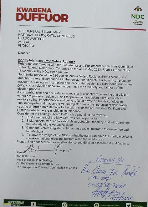 In a letter to the General Secretary of the NDC, Duffuor’s campaign team highlighted the incomplete and inaccurate delegates register and urged for sufficient time to clean the register to ensure a transparent election.