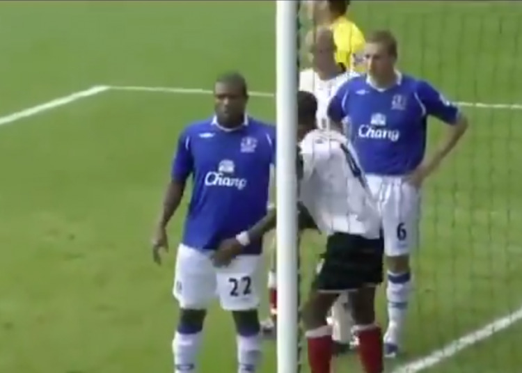 In the actual incident in a Premier League game between Everton and Fulham, John Paintsil had to use an unpopular tactic to distract the bulky Nigerian goalscorer.