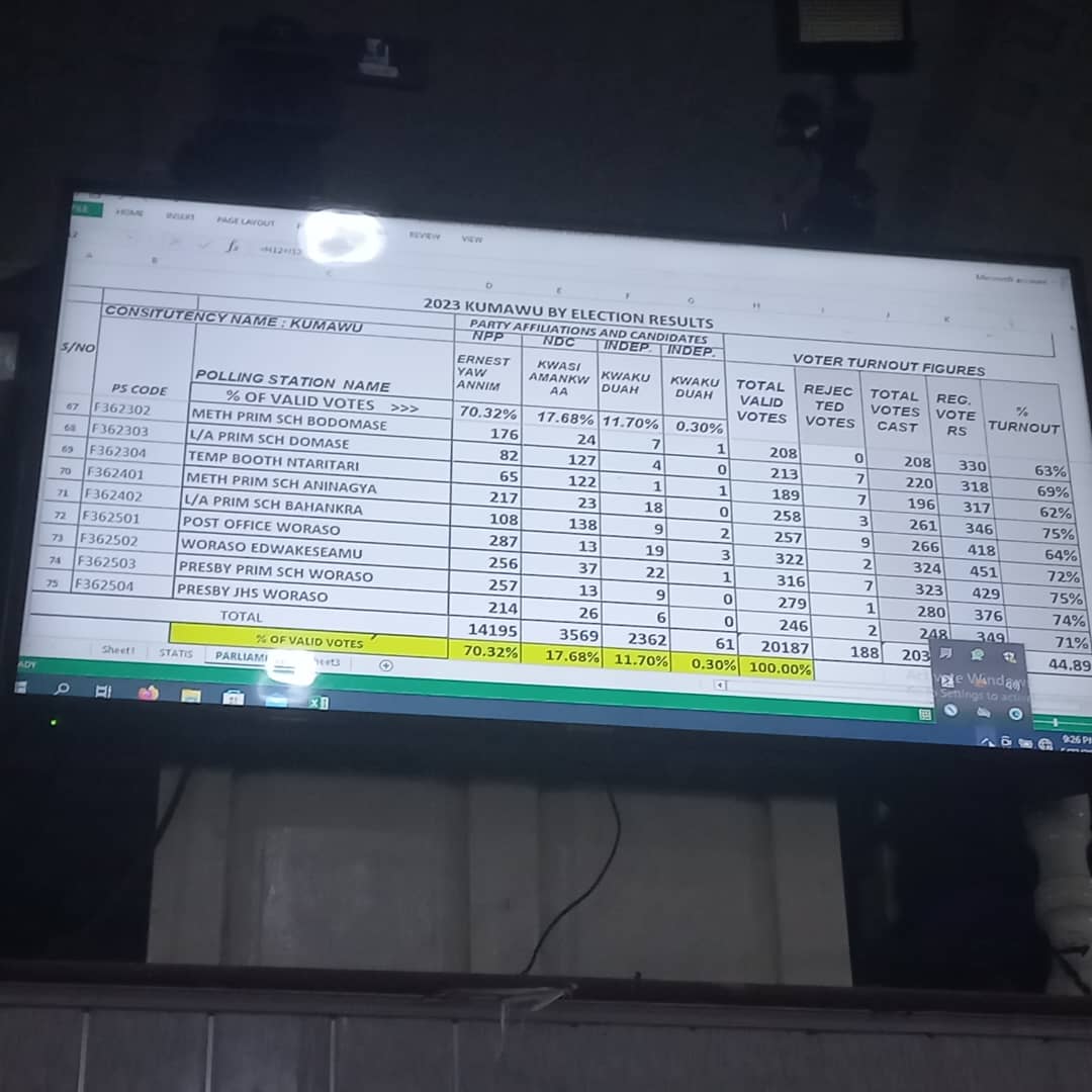The New Patriotic Party (NPP) parliamentary candidate, Ernest Yaw Annim has won the Kumawu by-election with over 70 per cent of the valid votes cast.