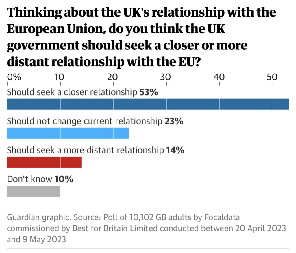 Overall, 53% of voters now want the government to seek a closer relationship with the EU than it now has, having left the single market and customs union, against just 14% who want the UK to become more distant.
