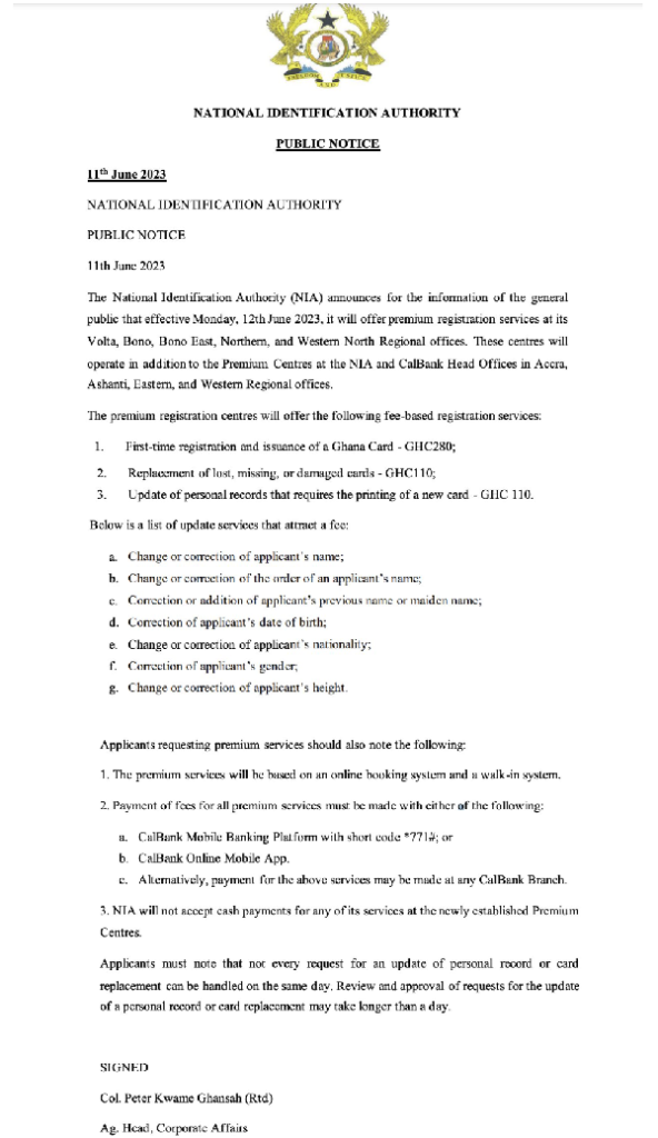 “The National Identification Authority (NIA) announces for the information of the general public that effective Monday, 12th June 2023, it will offer premium registration services at its Volta, Bono, Bono East, Northern, and Western North Regional offices. These centres will operate in addition to the Premium Centres at the NIA and CalBank Head Offices in Accra, Ashanti, Eastern, and Western Regional offices,” NIA noted in its statement.