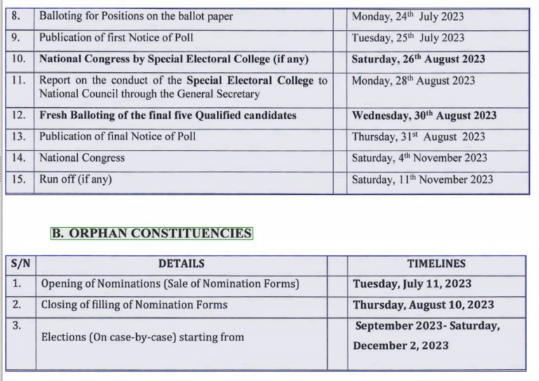 According to the revised timelines contained in a press release issued by the party on June 12, there will be balloting for positions on the ballot paper on Monday, 24th July, 2023, to be followed by publication of first Notice of Poll on Tuesday, 25th July 2023, and then a national congress by a special electoral college, if any, on Saturday, 26th August 2023.