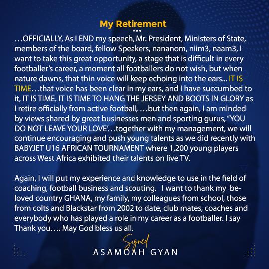 Black Stars striker, Asamoah Gyan retires from active football after being Ghana’s top scorer.