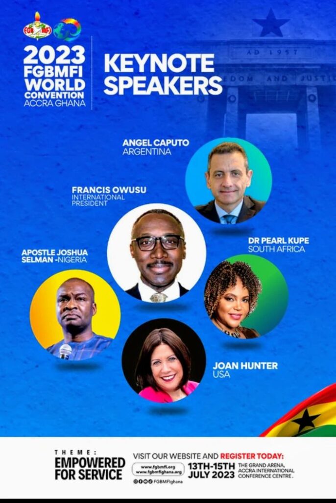 Keynote speakers invited to share some wisdom and knowledge at the business seminar are Apostle Joshua Selman from Nigeria, Angel Caputo from Argentina, Dr. Pearl Kupe from South Africa, Joan Hunter from the USA, and Francis Owusu from Ghana.