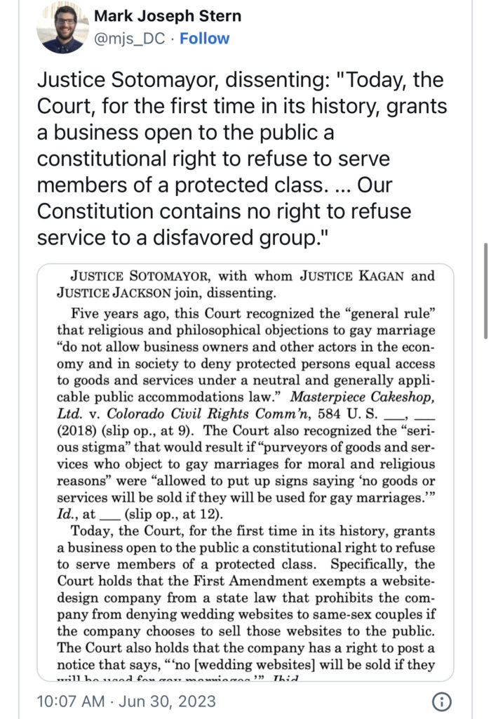 Sonia Sotomayor issued a blistering dissenting opinion. “Today, the Court, for the first time in its history, grants a business open to the public a constitutional right to refuse to serve members of a protected class,” she wrote. “The Court does so for the first time in its history.” She added that the Constitution “contains no right to refuse service to a disfavored group.”
