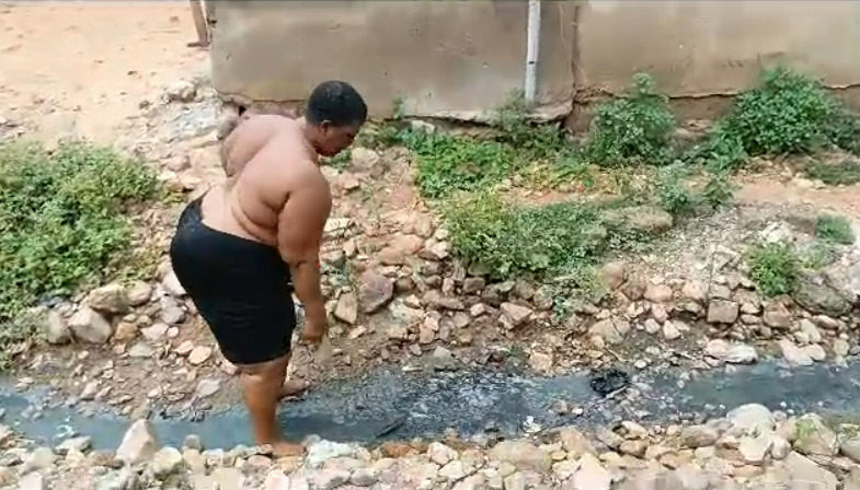 Her action couldn’t have gone unnoticed as she walked into a nearby waterway with her bare chest and foot with black shorts on.