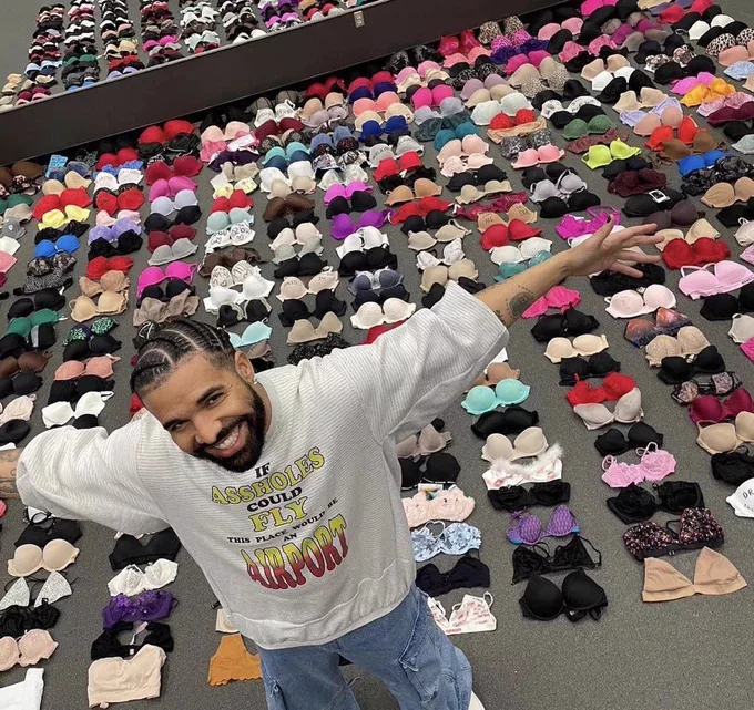 Drake has taken to his social media accounts to showcase his expansive collection of bras, with one image showing him seated on the floor, surrounded by bras of varying shapes, sizes, and colours.