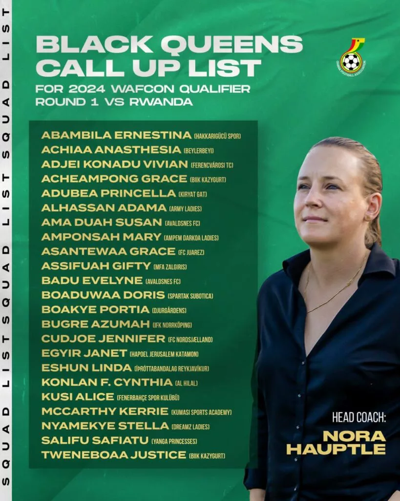 Nora Häuptle, Ghana’s women’s national team – the Black Queens – head coach, has named 23 players for the 2024 Women’s Africa Cup of Nations qualifier against Rwanda.