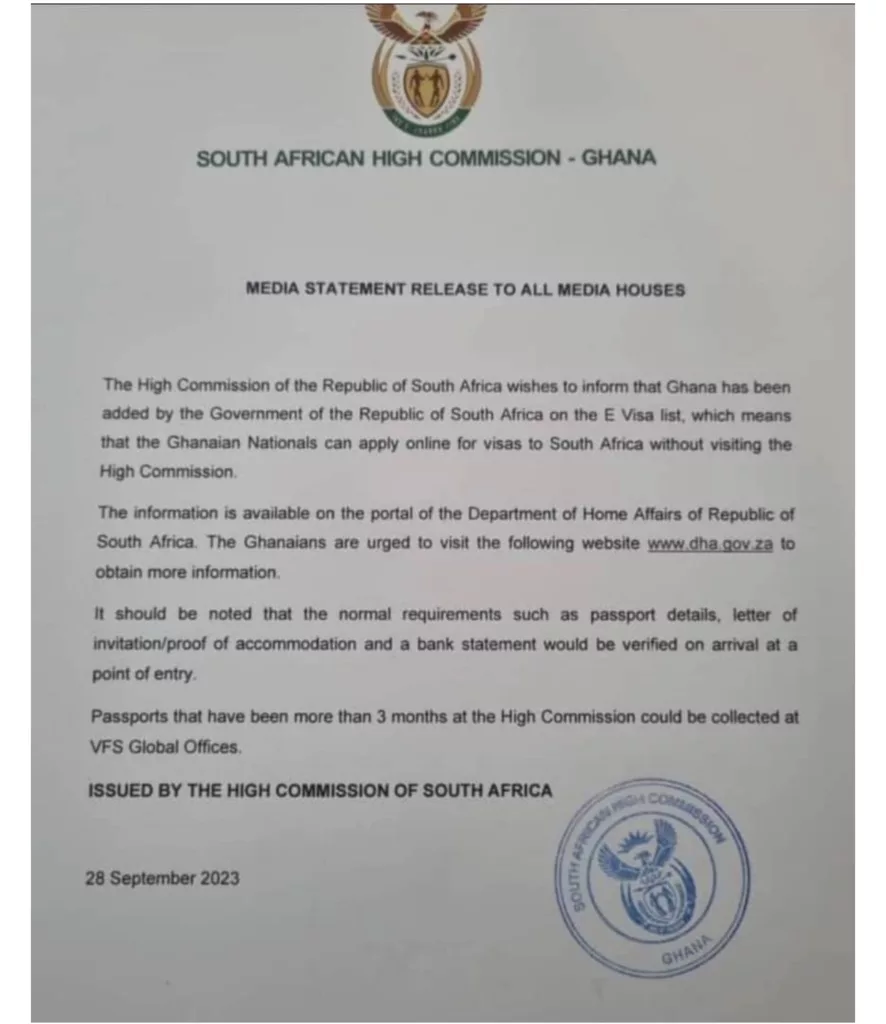 “The High Commission of the Republic of South Africa wishes to inform that Ghana has been added by the Government of the Republic of South Africa on the E Visa list, which means that Ghanaian Nationals can apply online for visas to South Africa without visiting the High Commission.”