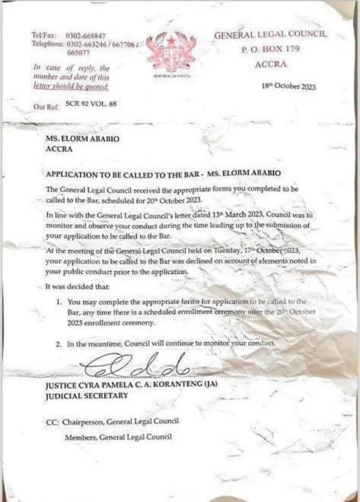 “At the meeting of the General Legal Council held on Tuesday, 17 October 2023, your application to be called to the Bar was declined on accounts of elements noted in your public conduct prior to the application.”