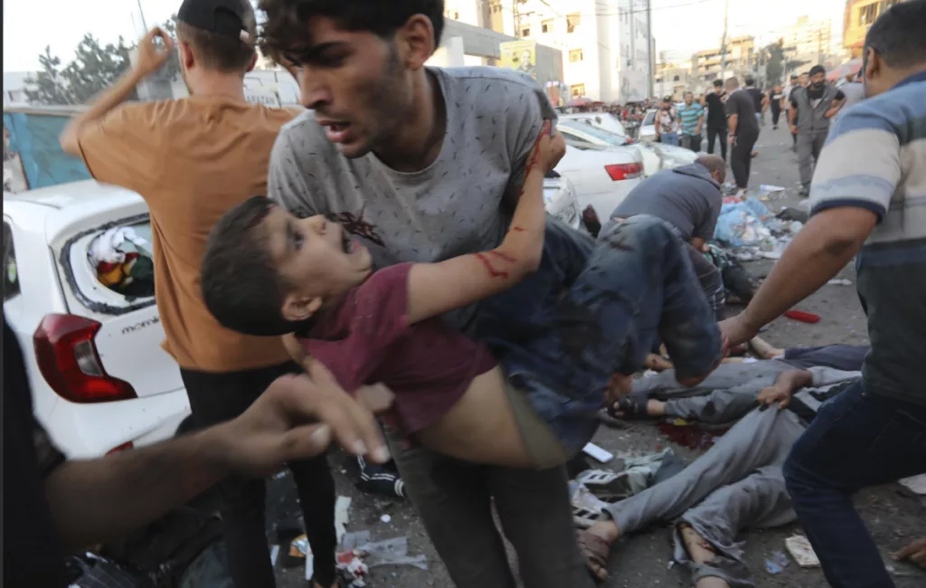 Strikes hit near the entrances of three hospitals in northern Gaza just as staff were trying to evacuate wounded to the south, hospital directors said. Footage showed the aftermath outside Gaza’s largest hospital, Shifa, where more than a dozen bloodied bodies were strewn next to damaged cars and ambulances. One bleeding boy screamed as he huddled on top of a woman sprawled on the pavement.