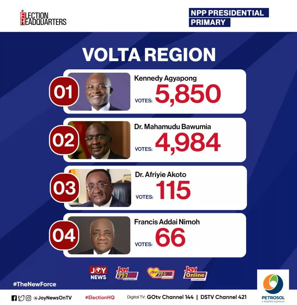 The Member of Parliament for Assin Central, Kennedy Ohene Agyapong has won the Volta regional race of the New Patriotic Party (NPP) presidential primary, with by 866 votes.