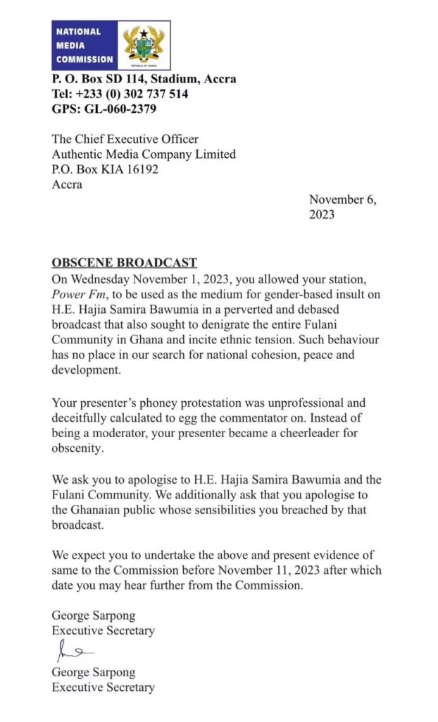 “On Wednesday November 1, 2023, you allowed your station, Power FM, to be used as the medium for gender-based insult on H.E. Hajia Samira Bawumia in a perverted and debased broadcast that also sought to denigrate the entire Fulani Community in Ghana and incite ethnic tension.”