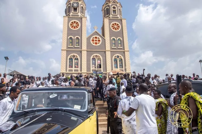 The Asantehene rode from the Manhyia Palace to the St. Peter’s Basilica in Kumasi.