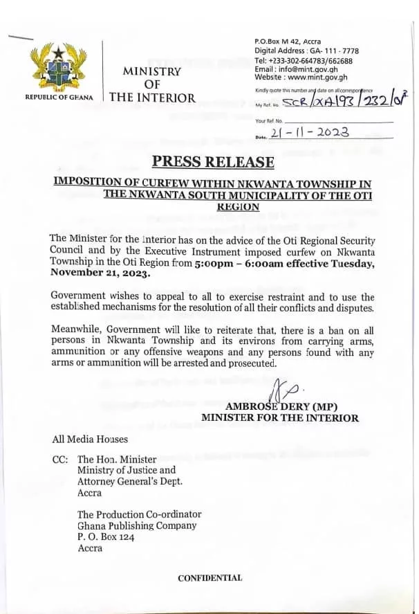 Amidst the curfew, the statement has said all persons in Nkwanta and its environs have been banned from carrying arms, ammunition or any offensive weapons.