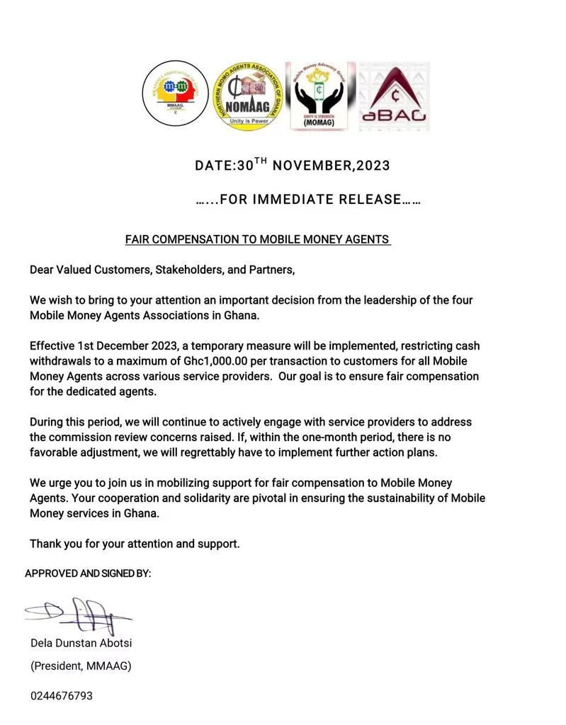 In a move to secure fair compensation for their services, Mobile Money Agents Associations in Ghana have announced a temporary measure to restrict cash withdrawals to a maximum of GH₵1,000 per transaction, effective December 1, 2023.
