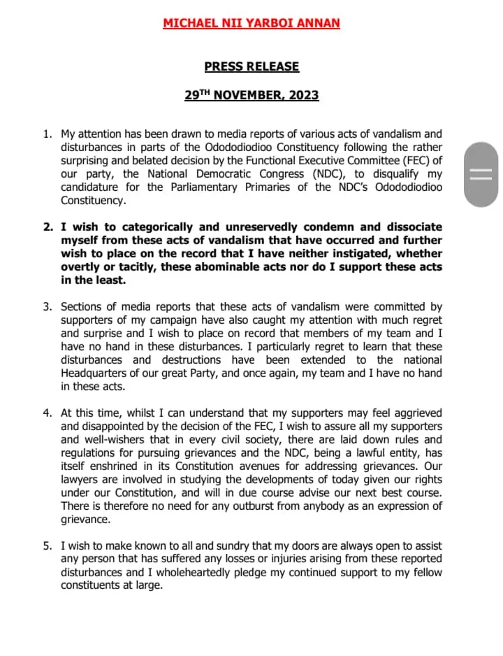 Mr Yarboi in an earlier statement also condemned the attack on the party headquarters by some of his aggrieved supporters on Wednesday.