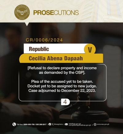 The individuals include: former Sanitation Minister; Cecilia Dapaah, Juaben Municipal Chief Executive(MCE) nominee; Alexander Kwabena Sarfo-Kantanka, former Public Procurement Authority (PPA) boss; Adjenim Boateng Adjei and three former officials of the Northern Development Authority (NDA) including the CEO, Sumaila Abdul Rahman.