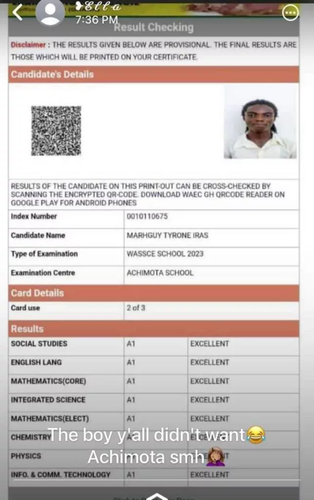 The 2023 West Africa Senior School Certificate Examination (WASSCE) results of Tyrone Iras Marhguy, who was nearly denied admission at Achimota Senior High School (SHS) have popped up on social media