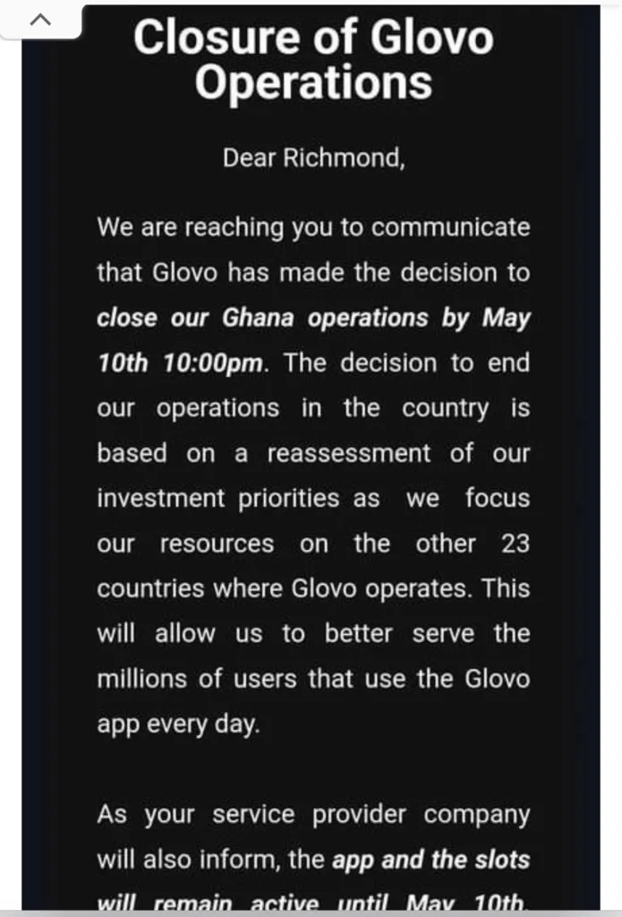 “We are reaching you to communicate that Glovo has made the decision to close our Ghana operations by May 10th at 10:00 pm. The decision to end our operations in the country is based on a reassessment of our investment priorities as we focus our resources on the other 23 countries where Glovo operates.”